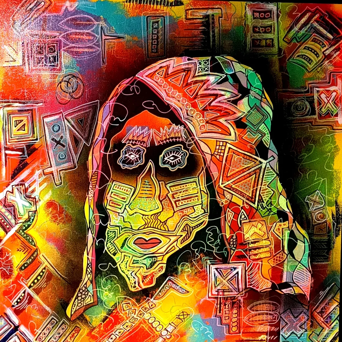 Mixed media on canvas.